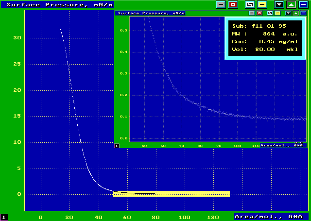 [Image] Due to the high sensitivity of balances it is possible to investigate the monomoleqular layers under the ultralow pressure from 0.005 to 1mN/m. At the picture you can see the dependence of surface pressure versus surface concentration for the Langmuir layer of C60.