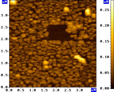 ССМ изображение кластеров серебра на стеклянной подложке после сканирования в контактной моде с силой F~10-6Н. Скан размером 3.7x3.6 мкм.