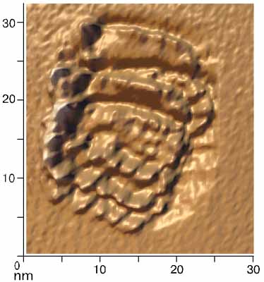 [Image] Сканирующая тунельная спектроскопия (dI/dz)I=const Парво Вируса на поверхности высоко ориентированного пиралитического графита, частота модуляции 18 кГц. Скан размером 28x32 нм.
