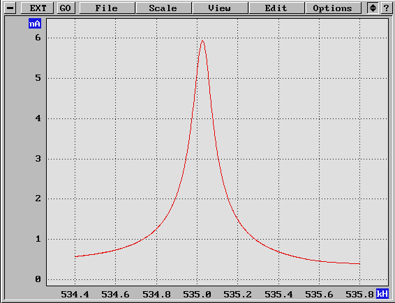 АЧХ кантилевера с резонансной частатой 535,04кГц (жесткий кантилевер) в высоком вакууме (Pост=10-10торр), добротност Q=22292.
