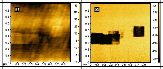 Thin bilayered metallic/dielectric film has been exposed by the current passing through the tip of conductive cantilever. It was found the direct formation of resistive nanoareas. Both atomic force (a1) and current mode (a2) images are presented in figures.