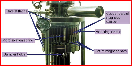 Vibration isolation is provided by three springs that suspend the microscope module that is connected with the carrying flange by a bellows connection. Oscillations are damped by CoSm magnetic eddy current damping.